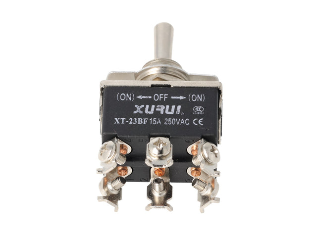 XT-23BF — INTERRUPTORES DE PALANCA 6 TORNILLOS Posiciones: PULS-OFF-PULS Capacidad: 20/15A 125/277VAC - 6 pin, tornillos, momentaneo, puls-off-puls está agotado y se enviará tan pronto como vuelva a estar disponible.